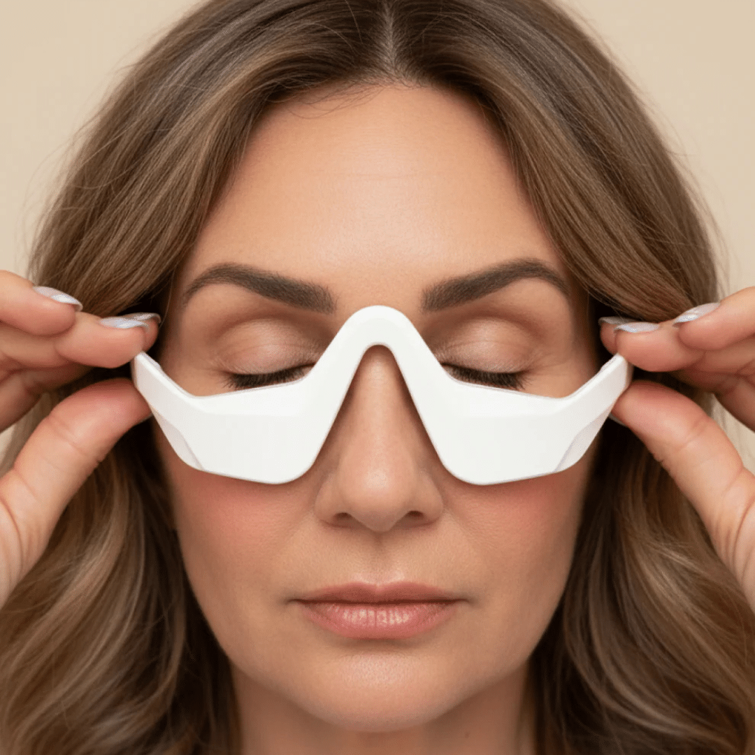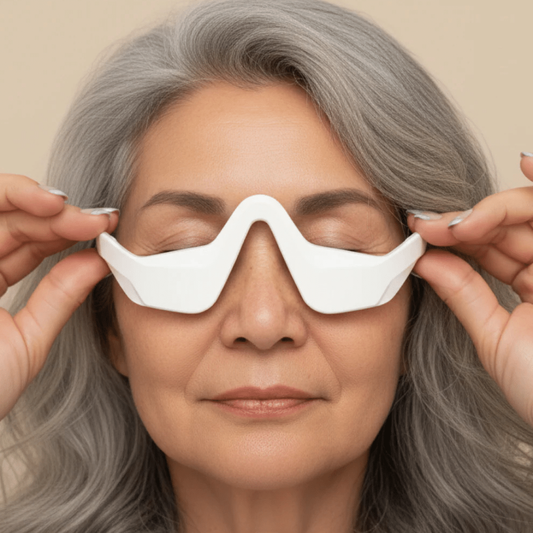 - Place Renewa EyeLift on your face like a pair of glasses, ensuring the pads sit flat against the skin under each eye.
