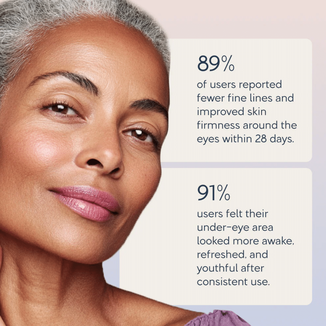 - Supports skin firmness and elasticity, helping the under-eye area look lifted rather than sagging.